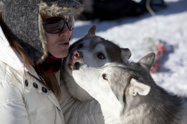 These two dogs had just returned from crosscountry snowboarding with their owner. They dragged him up the hill and then ran behind him on the way down. Pretty cool. They were so friendly!